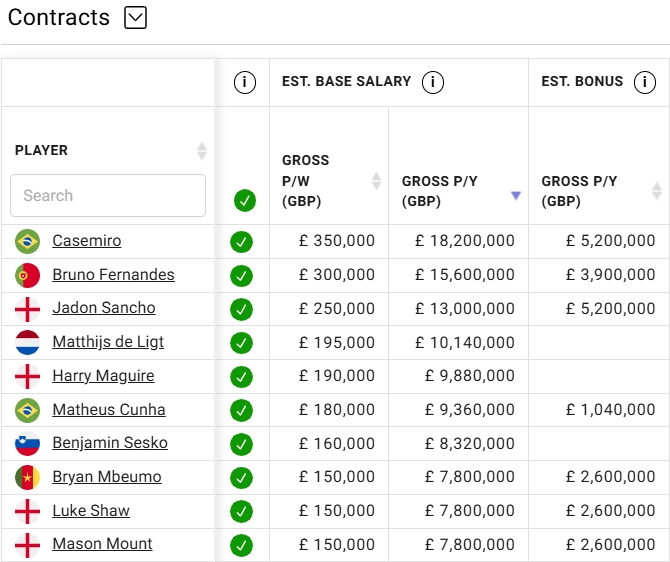 capology薪资网站数据显示,桑乔目前在曼联享受25万英镑的周薪待遇,折合年薪约1300万英镑,此外还包含最高可达520万英镑的绩效奖金。